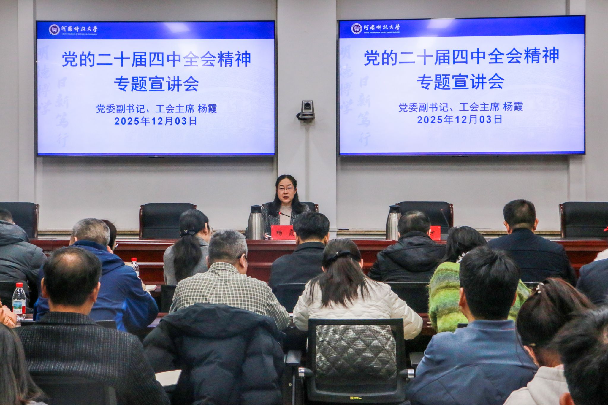 校新闻中心讯 按照学校学习宣传党的二十届四中全会精神工作安排,12月3日下午,党委副书记、工会主席杨霞为分管、联系单位师生作题为《锚定使命明方向 狠抓落实显担当——以高质量党建推动学校事业高质量发展》的宣讲报告。
