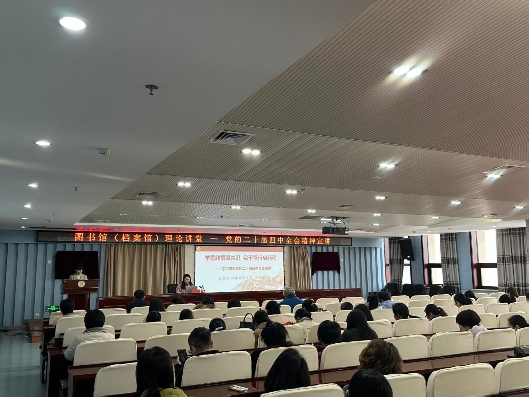 为深入学习宣传贯彻党的二十届四中全会精神, 12月4日下午,图书馆(档案馆)邀请马克思主义学院刘晓丽老师为全体教职工作题为《学思践悟凝共识 实干笃行启新程》的宣讲报告。