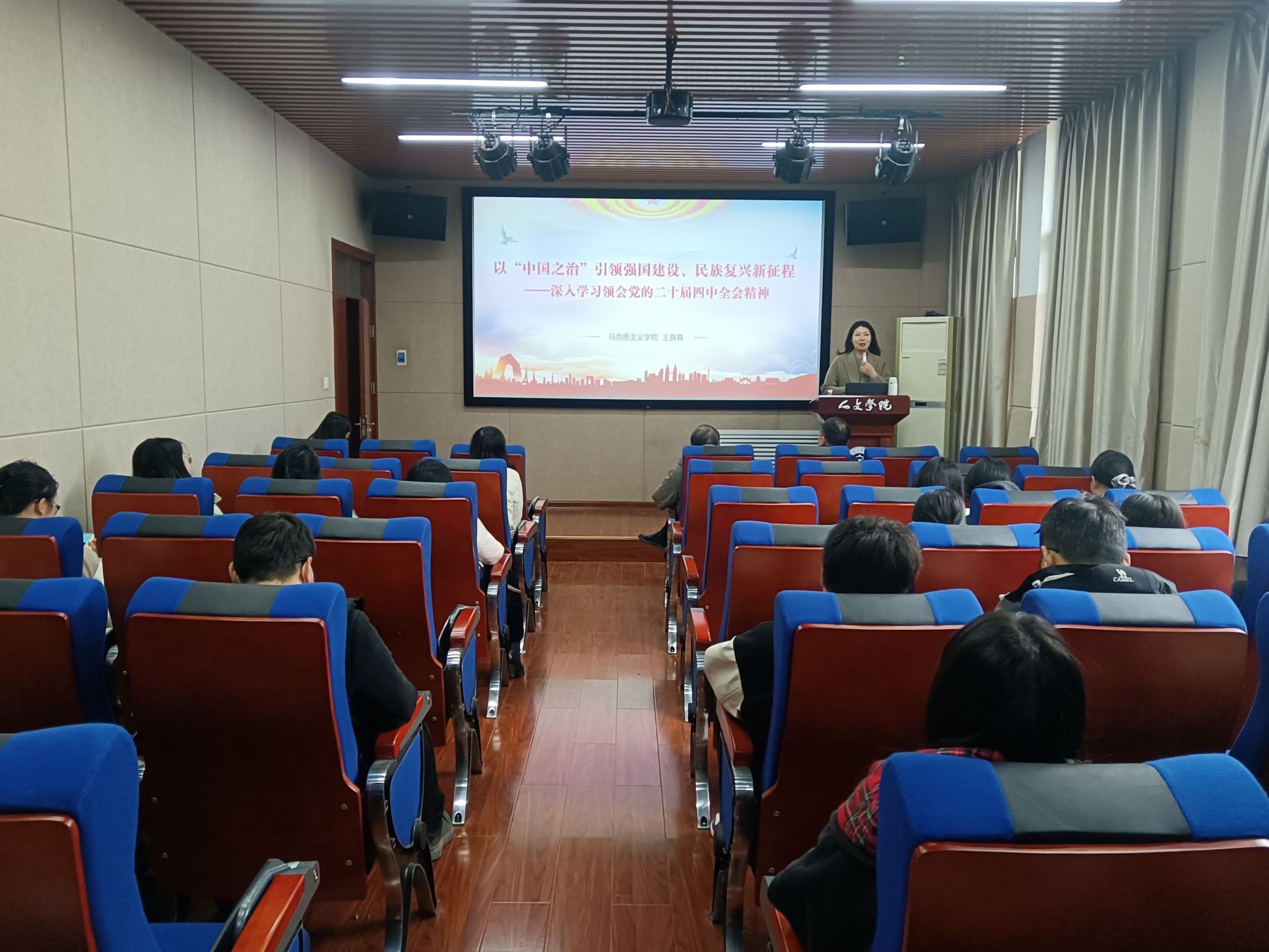 12月4日,人文学院在文科1号楼S106房间开展2025年“理论讲堂”系列讲座。马克思主义学院教师王真真应邀作题为《以“中国之治”引领强国建设、民族复兴新征程——深入学习领会党的二十届四中全会精神》的专题讲座。人文学院段文杰书记、彭富明院长、王云红副院长、裴艳艳副院长等学院领导,全体教师及研究生生代表参加本次讲座。