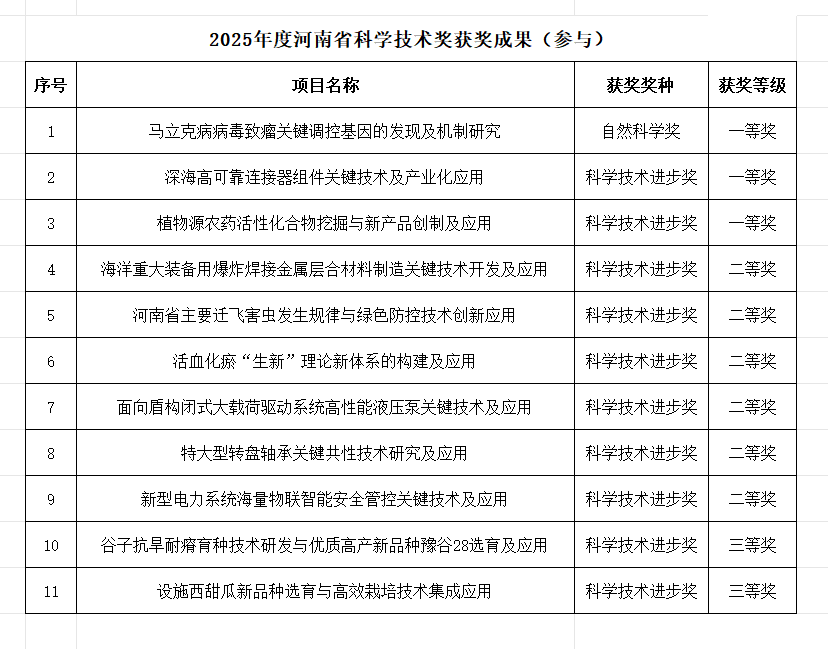 校新闻中心讯 近日,2025年度河南省科学技术奖励评审结果揭晓,我校共获奖21项。其中,一等奖5项(主持2项)、二等奖12项(主持6项)、三等奖3项(主持1项)、国际合作奖1项。获奖总数及主持一等奖数量均位居全省高校前列,有力展现了学校在“双一流”大学创建中的科研创新实力与核心竞争力,为学校高质量发展提供了强劲动能。